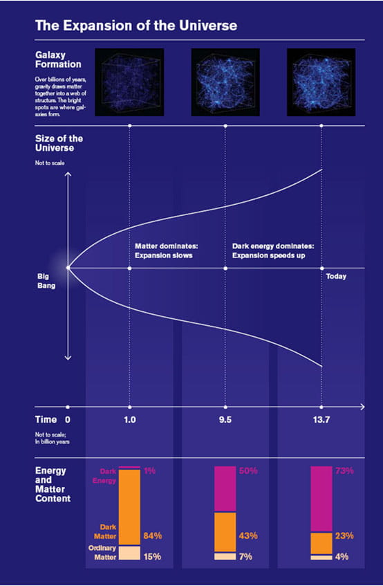 To date, scientists have offered two explanations for the accelerating expansion of the universe. Either some type of mysterious energy—dark energy, dark because unknown and unseen—drives the expansion, or Einstein's General Theory of Relativity, which describes how gravity works, is incorrect on cosmic scales; that is, our understanding of gravity is incomplete and gravity behaves differently from what we expect. Most theorists trust Einstein's theory of gravity and believe that dark energy drives the expansion. Its nature, however, remains unknown, somehow pushing objects apart while remaining unseen. From current observations, scientists estimate that ~70% of the mass-energy of the universe is dark energy.