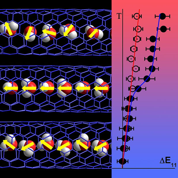 Confined within tiny carbon nanotubes, extremely cold water molecules line up in a highly ordered chain.
