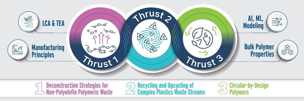To develop energy-efficient, selective, and tolerant chemo- and bio-catalytic and synthetic pathways to valorize diverse plastics waste streams and dramatically increase circularity.
