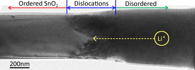 2 nanowire – a promising battery anode material – swelled, lengthened, and coiled as it charged but did not break apart like most bulk ceramic anodes. As the Li ions moved down the nanowire, dislocations (defects in the crystalline structure) formed just before the reaction front arrived. The dislocations may relieve stress so the brittle nanowire does not break, an important feature in battery materials expected to charge and discharge many times. They may also facilitate Li ions incorporating into the nanowire SnO