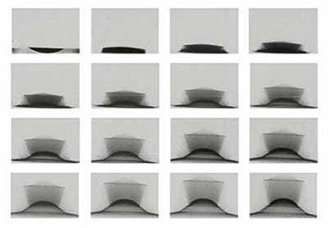 Proton radiography is a new diagnostic technique that produces detailed movies of high-speed shock and implosion tests. This sixteen-frame proton-radiography movie at the left shows how a tin disk responds to the shock wave produced by detonating a high explosive beneath the disk. First, the detonation's spherical shock wave bulges the disk (about 2 inches in diameter and 0.25 inch thick). Then, when the compressive shock wave reflects from the disk's upper surface, the shock becomes tensile, dislodging and levitating the spall layer (the "flying saucer"). The shock wave's high pressure and temperature also melt the tin (light gray region connecting the flying saucer and bulge).