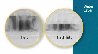 demonstration of proton radiography's ability to measure small density differences inside a test object. Two levels of coolant water in an engine block are clearly visible in these radiographs at the right. The ability to discriminate between small changes in density will help scientists track individual weapon parts during implosion.