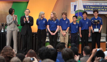 First Lady Michelle Obama and Secretary of The Department of Energy Steven Chu congratulate Albuquerque Academy, Albuquerque, NM, First Place winner in the 2010 National Science Bowl Middle School competition in Washington, DC on May 3, 2010.