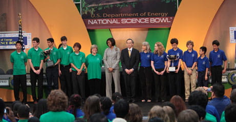 First Lady Michelle Obama and Department of Energy Secretary Steven Chu congratulate the 1st Place winners in the 2010 National Science Bowl in Washington, DC on May 3, 2010. North Carolina School of Science and Mathematics from Durham, NC won 1st Place among the 68 high school teams and Albuquerque Academy, Albuquerque, NM, won 1st Place among the 37 middle school teams.