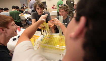 Campbell High School team members, from Gillette, WY, work on a challenge at the National Science Bowl in Washington, DC. The challenge is to clean up a simulated oil spill while producing as little waste as possible and avoiding leaving any oil in particular sensitive areas.